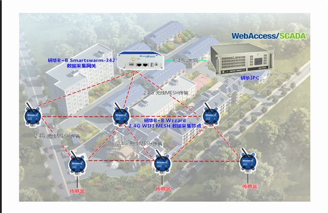環(huán)境監(jiān)控研華物聯(lián)網(wǎng)無(wú)線數(shù)據(jù)采集解決方案,輕松掌控大型廠區(qū)環(huán)境監(jiān)測(cè)應(yīng)用地區(qū): 大型廠區(qū) 應(yīng)用產(chǎn)品: Smartswarm-342 網(wǎng)關(guān)、Wzzard 2.4G WIFI MESH數(shù)據(jù)采集節(jié)點(diǎn)、研華IPC、WebAccess/SCADA 項(xiàng)目背景面臨挑戰(zhàn)1. 需要采用無(wú)線傳輸 2. 能連接4~20mA, 0~5V傳感器 3. IP67防護(hù)等級(jí) 4. 工業(yè)級(jí)寬溫設(shè)計(jì) 客戶廠區(qū)面積大且監(jiān)控設(shè)備分散,傳統(tǒng)的WIFI產(chǎn)品因傳輸距離問(wèn)題,可能無(wú)法提供好的解決方法,另外一個(gè)問(wèn)題,由于客戶的設(shè)備分散,并非每個(gè)位置都能擁有好的供電來(lái)源,如果使用標(biāo)準(zhǔn)的WIFI采集模塊,供電選擇上很有可能會(huì)出現(xiàn)問(wèn)題。因此最后我們?cè)诳蛻舻男枨簏c(diǎn)上,新增兩個(gè): 1. 低功耗產(chǎn)品,能支持電池安裝與外接電源,或使用太陽(yáng)能板供電。 2. 能支持自組網(wǎng) 和客戶溝通確認(rèn)需求之后,我們推薦客戶使用研華B+B Wzzard數(shù)據(jù)感知平臺(tái),以及WebAccess/SCADA作為整體方案的主要內(nèi)容。 方案設(shè)計(jì)1. Smartswarm-342 網(wǎng)關(guān) 2. Wzzard 2.4G WIFI MESH數(shù)據(jù)采集節(jié)點(diǎn) Smartswarm-342網(wǎng)關(guān):