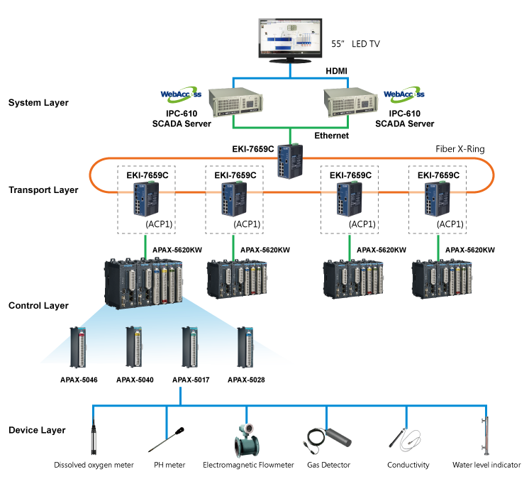 ?廢水處理廠是現(xiàn)代社會(huì)的基本基礎(chǔ)設(shè)施,用于凈化家庭和企業(yè)產(chǎn)生的廢水。它的一天24小時(shí)不間斷運(yùn)行,廢水處理包括多個(gè)過(guò)程,以去除固體,有機(jī)化合物和其他物質(zhì)。這樣復(fù)雜的工作流程需要仔細(xì)的管理,僅由工廠人員監(jiān)督是不夠的。此外,水源水質(zhì)可即時(shí)改變,任何疏忽或失誤都可能導(dǎo)致處理不當(dāng)或造成環(huán)境污染。因此,自動(dòng)監(jiān)測(cè)和控制系統(tǒng)在確保處理后的廢水排入下水道或河流之前,要滿足環(huán)境法規(guī)和政府標(biāo)準(zhǔn),一直發(fā)揮著非常重要的作用。 但是,如何以最小的成本有效地創(chuàng)建集中的監(jiān)控管理系統(tǒng)以獲得最大的價(jià)值,如何確保系統(tǒng)的穩(wěn)定性并保留將來(lái)的擴(kuò)展能力,所有這些都會(huì)受到硬件和軟件選擇的影響。研華提供功能強(qiáng)大的軟件和廣泛的硬件產(chǎn)品組合,包括先進(jìn)的WebAccess SCADA軟件,帶有I / O模塊的APAX可編程自動(dòng)化控制器和EKI以太網(wǎng)交換機(jī),使系統(tǒng)集成商可以通過(guò)一站式購(gòu)買(mǎi)快速完成廢水處理廠項(xiàng)目,而不必?fù)?dān)心兼容性。通過(guò)提供完全冗余的功能,該整體解決方案具有最大的可靠性,可以確保不間斷運(yùn)行。與此同時(shí)WebAccess強(qiáng)大而豐富的功能使開(kāi)發(fā)人員能夠輕松獲取數(shù)據(jù),并集成多個(gè)節(jié)點(diǎn)或平臺(tái),以滿足項(xiàng)目當(dāng)前和未來(lái)的需求,同時(shí)降低開(kāi)發(fā)和維護(hù)成本。