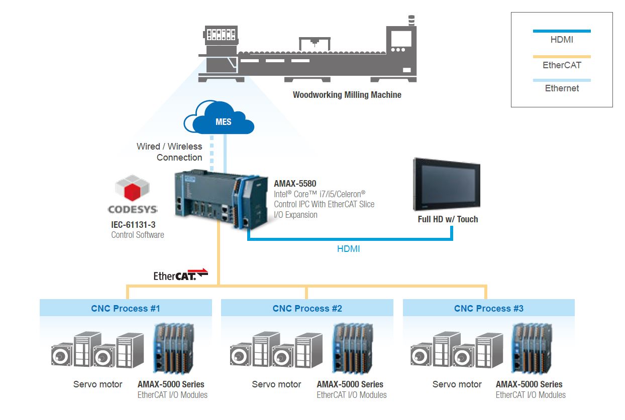 ▌▌客戶的需求提高加工速度和控制成本:加工速度是設備的核心指標。由于原始控制器是傳統(tǒng)的CNC系統(tǒng),因此軸和程序的數(shù)量相對固定。為了滿足新的效率要求,客戶必須購買三套CNC系統(tǒng)。隨著成本的增加,CNC系統(tǒng)之間的通信和調(diào)試成本也隨之增加。易于連接其他設備:現(xiàn)在連接了原來是獨立機械的木工設備。這臺CNC木銑床需要一個接口才能連接到上游雙頭鋸的PLC控制器。由于接口不足,傳統(tǒng)的CNC系統(tǒng)無法連接到上游PLC。高代碼兼容性:原始CNC系統(tǒng)的G代碼/ M代碼格式很嚴格。如果新軟件引入了新定義的M代碼,則需要制造商的R&D支持,這很困難并且需要很長時間。連接數(shù)據(jù)庫和MES以實現(xiàn)信息化:平板家具的調(diào)度和靈活處理要求將客戶的設備連接到數(shù)據(jù)庫和MES。原始的系統(tǒng)信息界面很難擴展和集成IT和OT。 ▌▌解決方案為了滿足上述客戶需求,研華與客戶共同開發(fā)了WISE-5580多工位木工CNC解決方案,將處理速度從2分鐘提高到20秒,實現(xiàn)了多工位擴展并連接了MES。 研華的邊緣控制解決方案,高性能Intel處理核心,采用子核和子系統(tǒng)結(jié)構(gòu),集Windows7開放式信息環(huán)境和CODESYS實時自動化內(nèi)核于一體,實現(xiàn)多軸運動控制、數(shù)控加工、數(shù)據(jù)庫和人機界面功能。嵌入式數(shù)控功能允許客戶靈活定義M代碼,支持EtherCAT總線,打破了傳統(tǒng)控制器軸控制的瓶頸,并與世林電氣的SDP EtherCAT系列伺服電機驅(qū)動器配合,輕松實現(xiàn)多站同時處理,大大提高了設備加工率。模塊化接口擴展允許設備連接上下游設備。研華的CODESYS數(shù)據(jù)庫模塊允許設備快速連接到MES以實現(xiàn)在線調(diào)度。