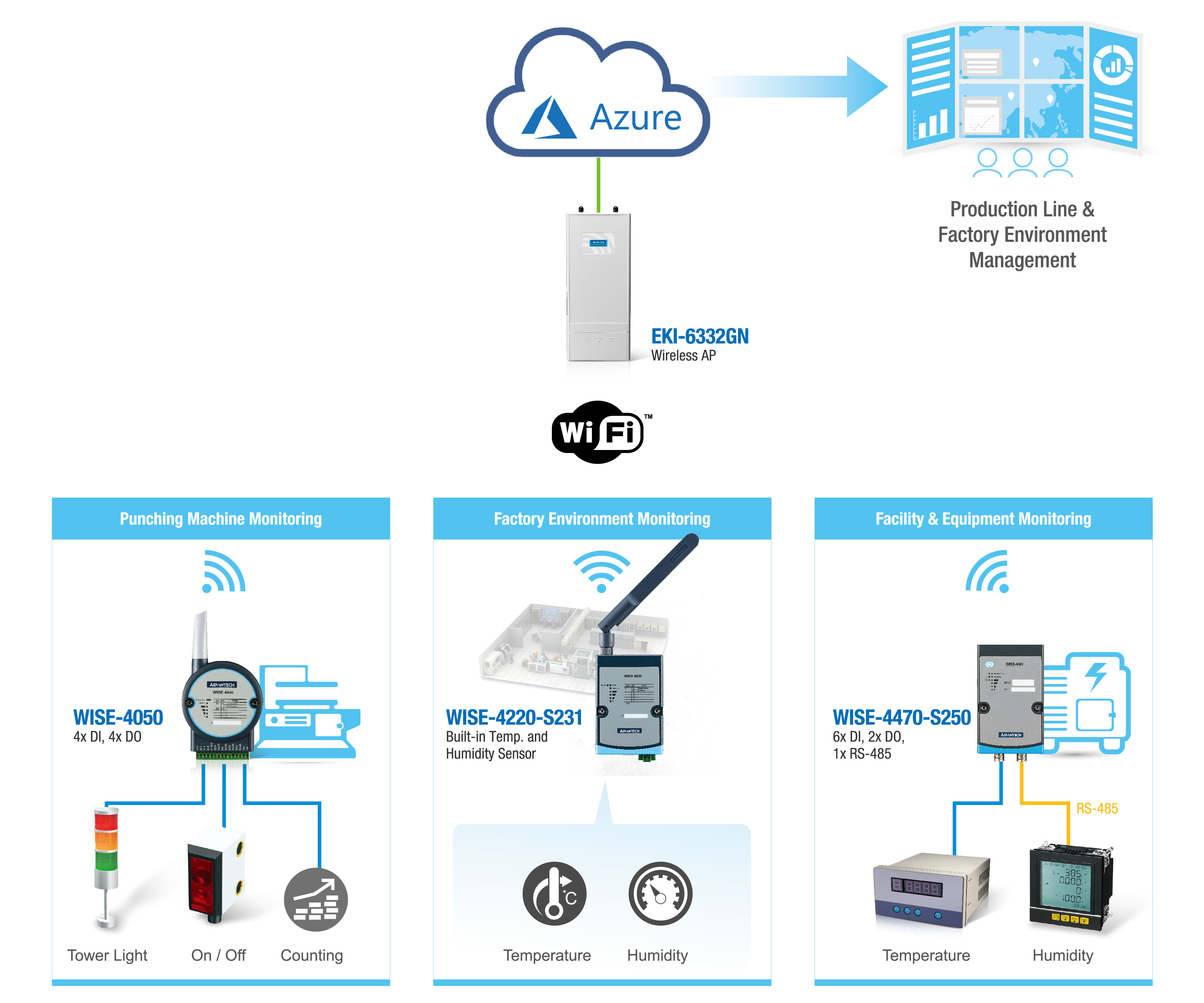 大多數(shù)現(xiàn)場設(shè)備是沒有PLC的沖壓機(jī)或沒有開放通信端口的封閉系統(tǒng)。根據(jù)設(shè)備的不同情況,研華公司的WISE-4000系列和EKI-6332GN Wi-Fi接入點(diǎn)采用了多個(gè)IoT無線I / O模塊,以滿足金屬加工廠將生產(chǎn)設(shè)備聯(lián)網(wǎng)的需求并能夠監(jiān)控設(shè)備和整體設(shè)施。